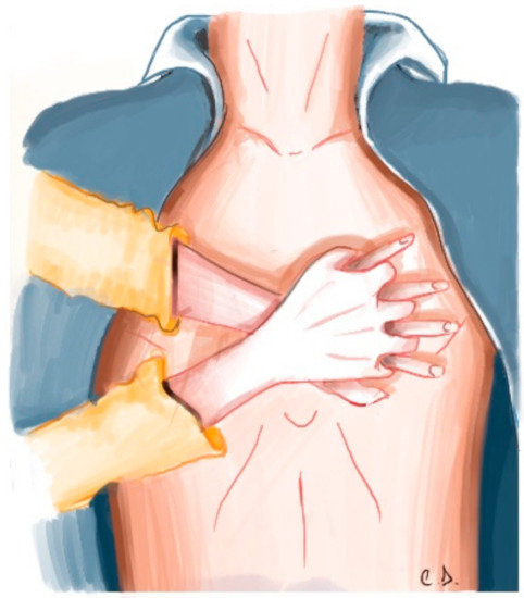 - Place the hypothenar region of the dominant hand in the lower half of the sternum of the victim and the other hand parallel to the first;