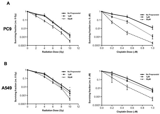3.1. Propranolol Enhances Cisplatin and Radiation Sensitivity of PC9 and A549 Tumor Cells In Vitro