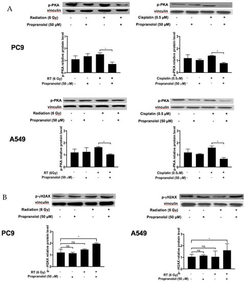 3.2. Propranolol Downregulates the β-AR Mediator p-PKA in PC9 and A549 Tumor Cells In Vitro