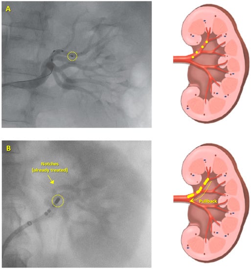 Types of renal denervation approach used. (A) Symplicity Spyral multielectrode renal denervation (RDN) catheter (Medtronic, Galway, Ireland) which allows simultaneous or sequential energy treatments into a left renal artery (each one out of four electrodes is 1 mm in length). (B) 7-Fr standard irrigated cardiac ablation catheter with a 3.5 mm electrode tip length (AlCath Flux eXtra Gold Full Circle 270°; VascoMed GmbH, Binzen, Germany) was inserted into a left renal artery and was moved in a circumferential pullback fashioned from the distal to the proximal renal artery segment. Yellow dots represent ablated spots.