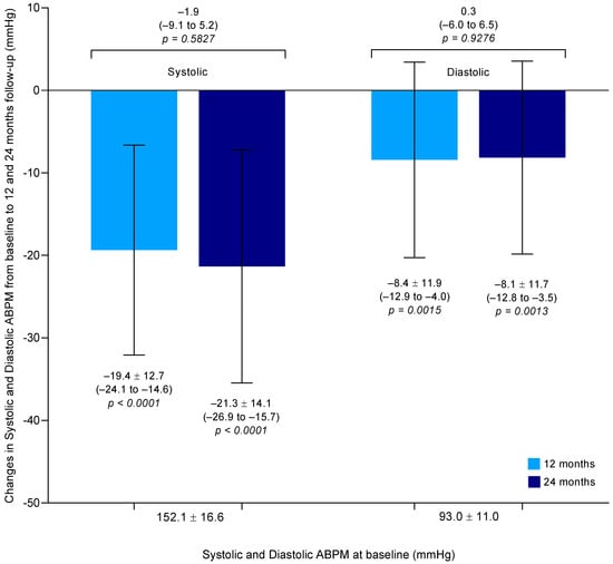 The mean change in systolic ABPM compared to baseline was −19.4 ± 12.7 mmHg (95% CI: −24.1 to −14.6) at the 12th month (p < 0.0001) and −21.3 ± 14.1 mmHg (95% CI: −26.9 to −15.7) at the 24th month (p < 0.0001) follow-up (difference between means −1.9 mmHg, 95% CI: −9.1 to 5.2, p = 0.5827), as shown in Figure 2. Similarly, the mean change in diastolic ABPM compared to baseline was −8.4 ± 11.9 mmHg (95% CI: −12.9 to −4.0) at the 12th month (p = 0.0015) and −8.1 ± 11.7 mmHg (95% CI: −12.8 to −3.5) at the 24th month (p = 0.0013) follow-up (difference between means 0.3 mmHg, 95% CI: −6.0 to 6.5, p = 0.9276), as shown in Figure 2.