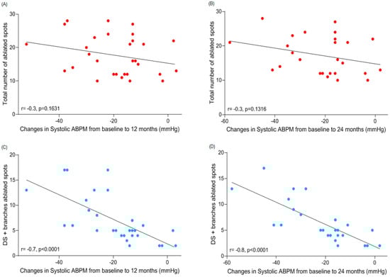 Correlations between change from baseline to 12 and 24 months follow-up in ambulatory systolic blood pressure after renal denervation and (A,B) number of ablated spots in total (red dots) and (C,D) distal segment summed to branches (blue dots) of renal arteries. ABPM = ambulatory blood pressure monitoring. DS = distal segment. Correlation for the number of treatments performed in the distal segment and branches were significant at both time points.