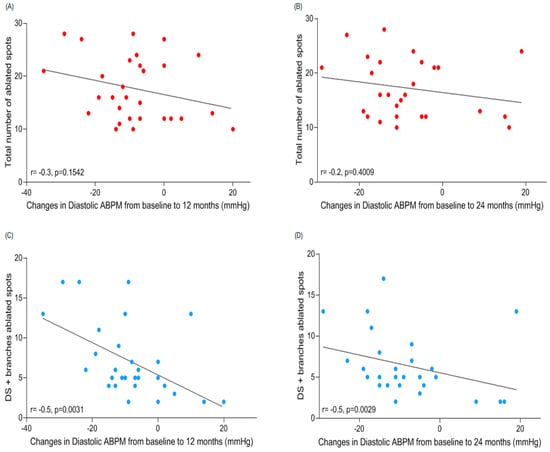 There were no correlations between ABPM diastolic blood pressure (DBP)-lowering effect at 12 (−8.4 ± 11.9 mmHg) and at 24 (−8.1 ± 11.7 mmHg) months post-procedure and the total number of ablated spots (r = −0.3, p = 0.1542, and r = −0.2, p = 0.4009, respectively) in renal arteries (Figure 4A,B), proximal segments (r = −0.3, p = 0.1294 at the 12th month; but there was a positive correlation at the 24th month r = 0.4, p = 0.0337), and middle segments (r = 0.1, p = 0.4497, and r = 0.3, p = 0.1367, respectively). Correlation between DBP fall and the number of treatments in the distal segment (5.4 ± 2.0) was significant at 12 (r = −0.5, p = 0.0054) and 24 (r = −0.4, p = 0.0208) months follow-up. For the number of treatments delivered in branches, correlation between DBP fall and the number of treatments was significant at 12 (r = −0.5, p = 0.0084) and 24 (r = −0.4, p = 0.0213) months follow-up. A similar correlation was observed for DBP-lowering effect and the number of ablated spots in distal segment summed to branches at 12 (r = −0.5, p = 0.0031) and 24 (r = −0.5, p = 0.0029) months follow-up as shown in Figure 4C,D, respectively.