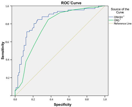 Curve between patients and controls (CRASH and cognitive reserve questionnaire CRQ). 1 ROC = receiver operating characteristic, 2 CRASH = Cognitive Reserve Assessment Scale in Health, 3 CRQ = Cognitive Reserve Questionnaire.