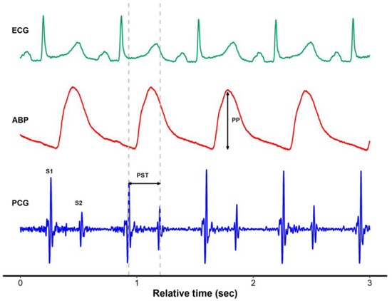 Representative plot of electrocardiogram, arterial blood pressure, and simultaneously recorded phonocardiogram using a digital esophageal stethoscope. ECG, electrocardiogram; ABP, arterial blood pressure; PCG, phonocardiogram; PP, pulse pressure; PST, phonocardiographic systolic time.