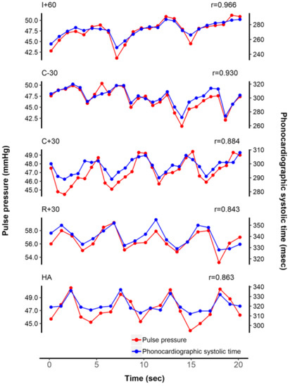 Purpose: To investigate the possibility of esophageal phonocardiography as a monitor for invasively measured pulse pressure (PP) and its respiratory variation (PPV) in patients undergoing liver transplantation. Methods: In 24 liver transplantation recipients, all hemodynamic parameters, including PP and PPV, were measured during five predetermined surgical phases. Simultaneously, signals of esophageal heart sounds (S1, S2) were identified, and S1–S2 interval (phonocardiographic systolic time, PST) and its respiratory variation (PSV) within a 20-s window were calculated. Beat-to-beat correlation between PP and its corresponding PST was assessed during each time window, according to the surgical phases. To compare PPV and PSV along with 5 phases (a total of 120 data pairs), Pearson correlation was conducted. Results: Beat-to-beat PST values were closely correlated with their corresponding 3360 pairs of PP values (median r = 0.568 [IQR 0.246–0.803]). Compared with the initial phase of surgery, correlation coefficients were significantly lower during the reperfusion period (median r = 0.717 [IQR 0.532–0.886] vs. median r = 0.346 [IQR 0.037–0.677]; p = 0.002). The correlation between PSV and PPV showed similar variation according to the surgical phases (r = 0.576 to 0.689, p < 0.05, for pre-reperfusion; 0.290 to 0.429 for the post-reperfusion period). Conclusions: Continuous monitoring of intraoperative PST with an esophageal stethoscope has the potential to act as an indirect estimator of beat-to-beat arterial PP. Moreover, PSV appears to exhibit a trend similar to that of PPV with moderate accuracy. However, variation according to the surgical phase limits the merit of the current results, thereby necessitating cautious interpretation.