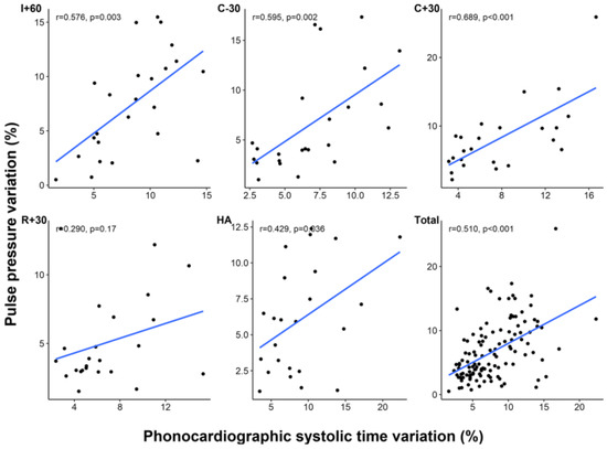 Correlation between phonocardiographic systolic time variation and pulse pressure variation at each time point. I + 60, 60 min after skin incision; C − 30, 30 min before clamping of inferior vena cava; C + 30, 30 min after clamping of inferior vena cava; R + 30, 30 min after liver graft reperfusion; HA, at the completion of hepatic artery reconstruction.