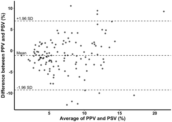 PSV and PPV showed significant correlation at most of the time points except at R + 30 (all time points, r = 0.510, p < 0.001; R + 30, r = 0.290, p = 0.170) (Figure 3). In Bland–Altman analysis, mean difference between PPV and PSV was –1.1% with 95% limits of agreement of –9.3% to 7.0% (Figure 4). Although SVV and PSV also showed significant correlation at time points before graft reperfusion (all time points, r = 0.319, p < 0.001), the correlation was weaker than that between PPV and PSV, and there was no significant correlation between SVV and PSV at timepoints after reperfusion (R + 30, r = 0.335, p = 0.109; HA, r = 0.055, p = 0.797) (Table 4).