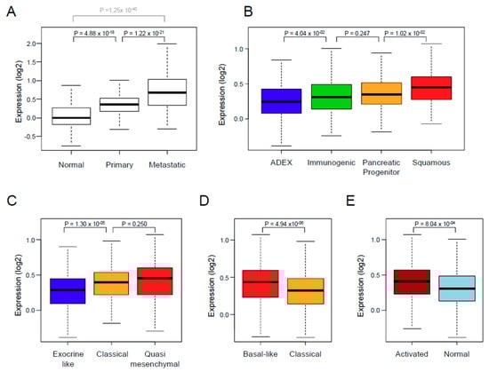 XPO1 expression in PAC. (A) Box plots showing XPO1 mRNA expression level (log2) in 95 normal pancreatic samples, 573 primary PAC, and 73 metastatic samples. For each box plot, median and ranges are indicated. The p-values are for Student t-test. (B–E) Similar to A, but in primary PAC only and according to the molecular subtypes that are defined by Bailey (B), Collisson (C), Moffitt (D: tumor subtypes), and Moffitt (E: stroma subtypes).