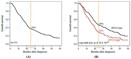 Overall survival data were available for 573 patients. With a median follow-up of 16 months (range, 1 to 156), 351 patients (61%) died, the two-year OS was 39% (95% confidence interval (CI), 35–44; Figure 2A), and the median OS was 19 months (range, 1 to 156). As shown in Figure 2B, XPO1 expression influenced OS, with 30% two-year OS (95% CI, 24–36) in the “XPO1-high” class versus 48% (95% CI, 42–56) in the “XPO1-low” class (p = 4.19 × 10−5, log-rank test). The respective median OS were 16 months (range: 1 to 126) versus 23 months (range: 1 to 156), and the hazard ratio (HR) for death was 1.56 (95% CI, 1.26–2.93) in the “XPO1-high” class when compared with the “XPO1-low” class (p = 4.78 × 10−5, Wald test).