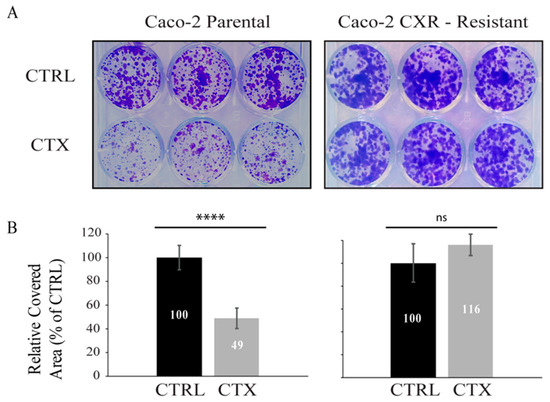 Colony forming assay of Caco-2 Parental and Caco-2 cetuximab resistant (CXR) clones. 2000 cells/well were plated with or without cetuximab (CTX) (10 µg/mL) for 10 days in DMEM medium supplemented with 10% fetal bovine serum, then cells were fixed, stained with Crystal Violet and quantified. Representative figures and quantification of the covered area by ImageJ are provided in A and B respectively. In (A) Caco-2 Parental cells (left) displayed 51% cell growth inhibition relative to CTRL, when treated with CTX whereas Caco-2 CXR–resistant cells (right) displayed undisturbed proliferation in the presence of CTX. (B) Quantification of relative covered area of Caco-2 Parental (left) and Caco-2 CXR–Resistant cells (right) in (A) by ImageJ is provided. The statistic was calculated by unpaired t-test, **** p < 0.0001, ns (not significant). This experiment was repeated more than three times.
