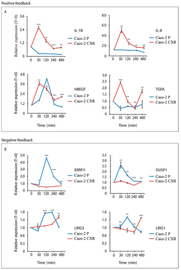 EGFR positive and negative feedback loops in Caco-2 Parental and Caco-2 cetuximab resistant (CXR) cell lines. Caco-2 Parental and Caco-2 CXR cell lines were treated in combination with cetuximab (CTX) (2 µg/mL) and EGF (20 ng/mL) at different time points (30, 120, 240 and 480 min) and qPCR analysis of EGFR positive (IL-1B, IL-8, HBEGF and TGFA) and negative (ERRFI1, DUSP1, LRIG1 and LRIG3) feedback genes was performed. In (A) EGFR positive feedback gene expression is reported. Caco-2 CXR activated immediate transcription of IL-1B, IL-8 and TGFA after 30 min from treatment and a decline of transcription level occurred after 4 hours, whereas Caco-2 Parental cells displayed non-significant changes in expression of IL-1B, IL-8 and TGFA. HBEGF displayed an overlapping profile in both Caco-2 Parental and CXR cell lines. In (B) EGFR negative feedback gene expression is reported. Caco-2 Parental cells showed an increase in the expression of ERRFI1, DUSP1, LRIG3 and LRIG1 genes, which was not observed in CXR cells. Statistical test of triplicated data was determined by multiple t-test, using the Holm-Sidak method, with alpha = 5%. Each row was analyzed individually, without assuming a consistent (standard deviation) SD. *** p < 0.0005, ** p < 0.01, * p < 0.05 and ns (not significant).