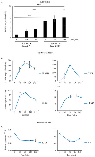 The present study focuses on the involvement of EGFR positive and negative feedback genes in the establishment of CTX resistance in metastatic CRC patients. Among positive EGFR feedback regulators, we evaluated the expression profile of the EGFR ligands TGFA and HBEGF, which were previously found to be involved in CTX resistance [23,24], as well as the pro-inflammatory cytokines IL-1B and IL-8, which were negatively associated with monoclonal antibody response in xenopatients mice and patient specimens [21,25]. Among EGFR negative feedback loops we focused on ERRFI1, DUSP1, LRIG1, and LRIG3 [26]. We also tested the expression of these genes in CTX-resistant cells upon modulation of the Glucocorticoid Receptor (GR) activity.