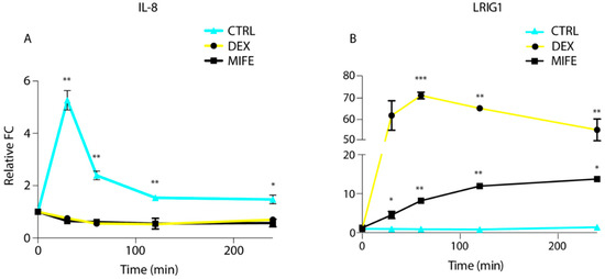 Comparison of gene expression level of EGFR positive (IL-8) and negative (LRIG1) feedback loops following dexamethasone (DEX) and mifepristone (MIFE) treatment in cetuximab resistant (CXR) resistant cells. Caco-2 CXR cells were pretreated with DEX (1 µM) or MIFE (1 µM) and stimulated with a combination of cetuximab (CTX,2 µg/mL) and EGF (20 ng/mL) at different time points (30, 60, 120 and 240 min). qPCR analysis was performed for IL-8 and LRIG1 feedback loops. (A) IL-8 gene expression level following DEX or MIFE treatment shows an immediate decrease in gene expression (after 30 min), maintained during the whole-time (up to 8 hours) compared to time 0. CTRL showed a five folds increase in gene expression level after 30 min from CTX and EGF treatment. (B) Increase in LRIG1 gene expression following DEX or MIFE treatment. Notably, Caco-2 CXR following DEX treatment displayed a burst in LRIG1 expression with seventy folds gene expression increase when compared to time zero. Statistical test of triplicated data was determined by multiple t-test, using the Holm-Sidak method, with alpha = 5%. Each row was analyzed individually, without assuming a consistent SD. *** p < 0.0005, ** p < 0.01, * p < 0.05.
