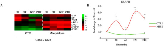Inhibition of glucocorticoid receptor reactivates negative feedback loops in cetuximab-resistant Caco-2 cell line. (A) Heatmap showing gene expression of EGFR positive (IL-1B, IL-8 and TGFA) and negative (LRIG3, LRIG1, ERRFI1 and DUSP1) feedback loops, in Caco-2 cetuximab resistant (CXR) cells pretreated with and without mifepristone (MIFE, 5 µM) for 10 min and stimulated with a combination of cetuximab (CTX, 2 µg/mL) and EGF (20 ng/mL) at the indicated time points (30, 60, 120 and 240 min). (B) ERRFI1 gene expression profile over time following treatments described in A. Statistical test of triplicated data was determined by multiple t-test, using the Holm-Sidak method, with alpha = 5%. Each row was analyzed individually, without assuming a consistent SD. *** p < 0.0005, ** p < 0.01, * p < 0.05.