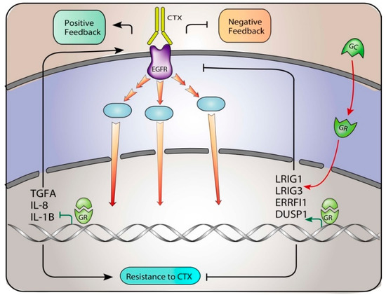 In line with this concept, our data showed that upon acquisition of resistance to CTX, EGFR pathway feedback loops display an alteration compared to control cells, which could be reversed by administration of the steroid hormone dexamethasone. These data are relevant also for patients, where LRIG1 was found to be negatively associated to CTX response, while IL-8 and IL-1B were positively associated [21,22].