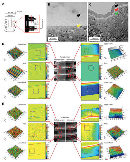 (A) Simplified diagram of, and terminology regarding, the screw-shaped implants used in this study. The inner half, close to the minor diameter of the implant, was defined as the root area. The outer half, close to the major diameter of the implant, was called the crest area. The upper half of the thread was defined as the upper flank (UF), and the lower half was the lower flank (LF). (B) Cs-corrected transmission electron microscopy (Cs-STEM) analysis retrieved from focused ion beam specimens of the turned and (C) acid-etched (SLA) implants on day 10. There were no cells detected on the turned surface (yellow arrow) beneath the Pt-coated layer (black arrow), whereas, cells were detected on SLA surface (red arrow). (D) Confocal laser scanning microscopy (CLSM) of the turned and (E) SLA surfaces measured in root, UF, and LF. The turned implant revealed a smooth texture, and no cells were seen after in vivo experiment. The SLA implants displayed cell attachment in the root area, depicted as irregular structure of grey color on top of roughened topography in the 3D mapping of the CLSM.