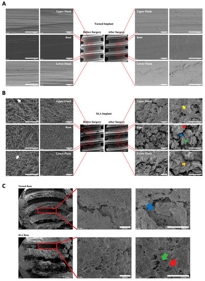 Under the circumstances of immobility, exogenous foreign material such as Ti implants, exhibit bone demarcation instead of implant rejection; hence, the stability-enhancing structures of an implant may be of particular importance [29]. Cylindrical implants without threads have uniform but weak attachment to the bone, which is especially weak to shear stress. This weakness may have been one reason why the cylindrical implants displayed a lot of bone resorption in situ [30]. With regards to the electron microscopic images captured in the in vivo environment of this study, all the implant components shown, including the thread structure and microtopography, are important in the cellular response during the osseointegration process. Altering the surface roughness of a material may affect the biological processes regulating the behavioral mechanisms (e.g., cell activity, adhesion) of osteoblastic/immune cells, such extracellular protein deposition at the moment of implantation has an influence on the cellular behavior which later leads to differences in in vivo outcomes [31,32]. This study was qualitative. Quantitative investigations are necessary for various modified surfaces. Recently, implants made of other materials—including ceramic and polyetheretherketone (PEEK)—have been developed, the surfaces of which need to be further investigated with respect to this in vivo cellular response [33,34].