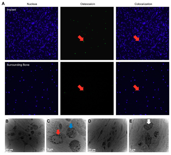 (A) Immunofluorescence microscopy (IF) of the SLA implants and surrounding bone on day 10, including nucleus, marker, and colocalization. Osteogenic cells (red arrow) are attached to the SLA implant surface rather than to the surrounding bone, which showed few osteogenic cells. The magnification of the photographs is ×200. (B) Transmission electron microscopy (TEM) analysis of retrieved SLA implant at day 10. (C) Macrophages (blue arrow) and osteogenic cell (red arrow) can be seen in the SLA implants. (D) TEM analysis of surrounding bone on day 10. (E) In the surrounding bone, osteocytes (white arrow) were detected.