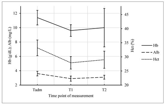 Hemoglobin (Hb), hematocrit (Hct), and albumin (Alb) before admission (Tadm), 2 h (T1), and 24 h (T2) after the intervention, respectively. Data presented as mean values (SD) (Tadm to T1 all p < 0.001).