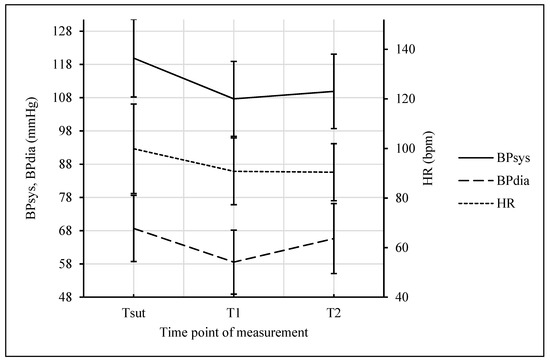 There was a significant decrease in Hb, Hct, and albumin between Tadm and T1 (all p < 0.001). Mean Hb dropped from 11.60 ± 1.00 to 9.61 ± 0.80 g/dL, mean Hct from 33.56% ± 2.84% to 27.78% ± 2.23%, and albumin from 3.65 ± 0.36 to 2.82 ± 0.36 mg/L, respectively. From T1 to T2, variables did not change significantly (see Figure 1). Systolic (BPsys) and diastolic blood pressure (BPdia), as well as maternal heart rate (HR), decreased from Tsut to T1 significantly (all p < 0.001). Mean BPsys dropped from 120.13 ± 11.10 to 107.80 ± 11.11 mmHg, mean BPdia from 69.15 ± 9.84 to 58.31 ± 9.45 mmHg, and mean HR from 99.92 ± 18.51 to 90.70 ± 13.33 bpm, respectively. Mean BPdia increased significantly from 58.32 ± 9.45 at T1 to 65.88 ± 10.63 mmHg at T2, while BPsys showed the same trend from 107.51 ± 11.27 at T1 to 109.67 ± 10.90 mmHg at T2, but was not statistically significant. Maternal HR was stable from T1 to T2 (see Figure 2).