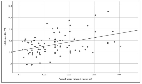 Correlation between the volume of amniodrainage at surgery and changes of maternal serum hematocrit (Hct) within 24 h after the intervention (Spearman’s rho 0.325; p = 0.003).