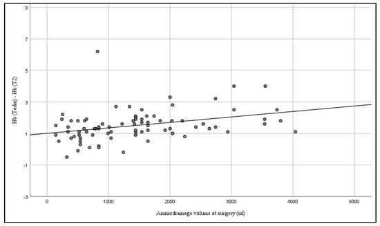 Correlation between the volume of amniodrainage at surgery and changes of maternal serum hemoglobin (Hb) within 24 h after the intervention (Spearman’s rho 0.379; p < 0.001).