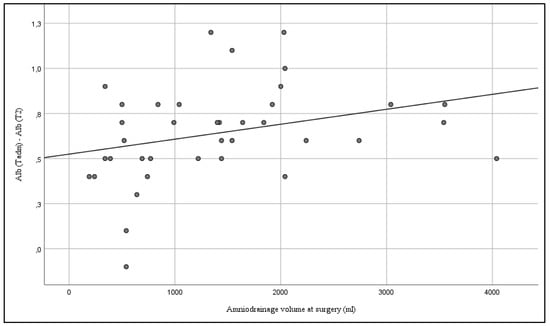 Correlation between the volume of amniodrainage at surgery and changes of maternal serum albumin (Alb) within 24 h after the intervention (Spearman’s rho 0.360; p = 0.027).
