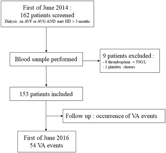 Platelets play a role in VA stenosis development. The key event in VA failure is intimal hyperplasia. Platelets are involved in intimal hyperplasia, like shear stress, hypoxic injury, inflammation, uremia, and thrombosis [22]. Intimal hyperplasia is defined as the abnormal migration and proliferation of vascular smooth muscle cells in response to an injury of the vessel and is promoted by the inflammatory response. Platelets are found in the intimal hyperplasia of explanted vascular prostheses [19]. Large platelets with high MPV, containing denser α granules, aggregate faster after ADP or collagen stimulation and secrete PDGF, TGF-β [23], fibrinogen, and beta-thromboglobulin [12]. PDGF and TGF-β are two well-known factors implicated in the initiation of intimal hyperplasia. PDGF is a growth factor involved in the development of intimal hyperplasia [24] and stimulates smooth muscle cells and inflammatory cell mobilization, migration, and proliferation. TGF-β is a pro-inflammatory cytokine involved in the development of atheromatous plaques. PDGF [22] and TGF-β [25] are described in a large amount in the intima of VA stenosis. In addition, platelets are important in the initiation of thrombosis and activated platelets could increase the thrombotic risk. Higher platelet aggregability was reported in patients with VA dysfunction [26]. Stenosis promotes thrombosis in VA. In our study, MPV is not associated with VA thrombosis. It is probably due to a low number of events. Thrombosis can be prevented by having a closer look at stenosis. An active screening strategy by systematic Doppler or Transonic® flow rates could reduce the risk of thrombotic events of VA [27,28]. European and international guidelines recommend regular and objective monitoring of access function (ideally every month for AVG and every 3 months for AVF) [29]. A significant decrease in access flow over 20% requires endovascular exploration and, if necessary, stenosis treatment by endovascular or surgical methods [29]. Detection of stenosis by frequent flow measurement and rapid angiography achievement could explain our low thrombosis rate despite the high-risk profiles of the patients.