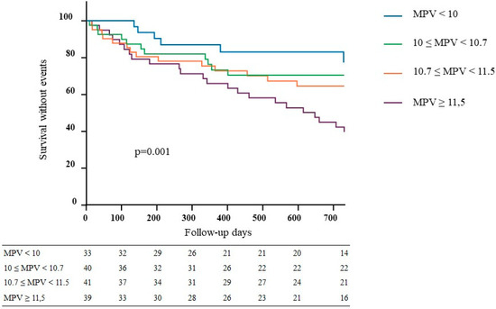 The Cox multivariate analysis (Table 3) showed an independent association between the MPV and the occurrence of any VA event; the odds ratio (OR) was 1.58 (1.17–2.14; p = 0.003) for every 1 fL increase of MPV.