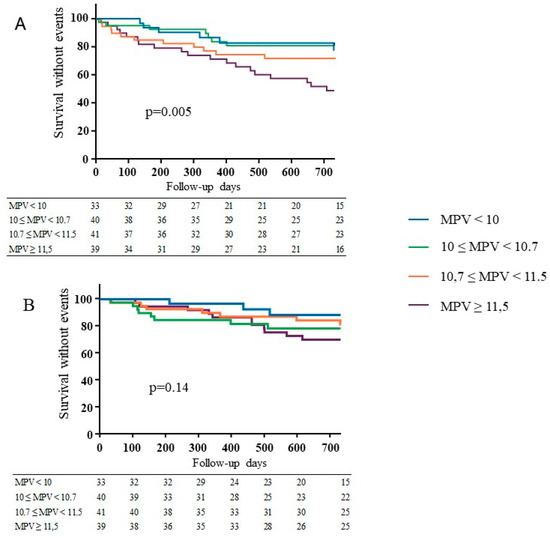 Data are expressed as the mean and SD for data with normal distribution or median (minimum, maximum) for non-normally distributed data. All numeric variables were tested for normality by the Kolmogorov–Smirnov and Shapiro–Wilk tests. Statistical analyses were performed with the Prism (GraphPad Software Inc., La Jolla, CA, USA) and MedCalc (Ostend, Belgium) software. Differences were considered significant for p = 0.05. Baseline variables were compared by chi-square tests for categorical variables, t-tests for continuous variables with Gaussian distributions, and Mann–Whitney tests for continuous variables with non-Gaussian distributions. Correlations between MPV and continuous variables were obtained using Spearman correlation coefficients. The Kaplan–Meier method was used to estimate the cumulative VA event-free rate for the time to the first VA events in patients depending on the quartile of MPV. The log-rank test was used to compare the Kaplan–Meier curves. Univariate and multivariate analyses of VA events were performed using a Cox proportional hazard model as a function of MPV as the continuous variable. In multivariate analyses, the model was adjusted for age, sex, platelet count, native AVF, absence of treatment with antiplatelet agents (AAP), antithrombotic treatment, C-reactive protein (CRP), hemoglobin, and treatment with a stimulating agent of erythropoiesis (SAE). Software R [21] and the Survival package were used. The VA event-free survival was censored by death. Only the first event was included in the analysis.
