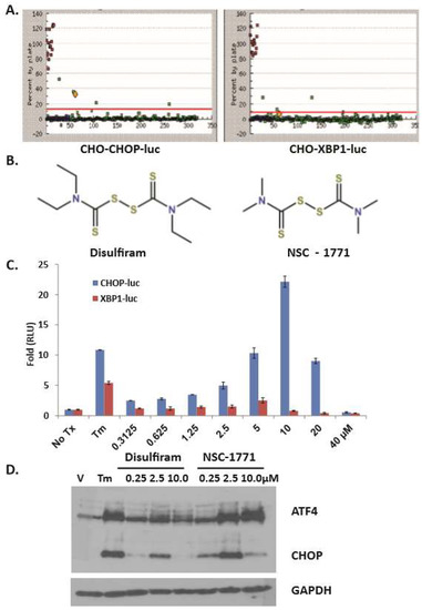 Dithiocarbamates activate Chop Expression. (A), Campaign view of a 384 well plate of CHO-Chop-luc (left) and CHO-Xbp1-luc (right) cells treated with compounds from the MicroSource Spectrum collection for 8h; green dots: high throughput screen (HTS) cmpd, blue dots: DMSO, red dots: tunicamycin (Tm); yellow dot: Disulfiram (DSF); assay Z’: CHOP = 0.84, XBP1 = 0.88. (B), Structure of DSF (left) and analog NSC-1771 (right). (C), Secondary concentration response assays with reporter cell lines; error bars represent standard deviation. (D), Immunoblot analysis with whole cell lysates from DSF- or NSC-1771-treated murine embryonic fibroblasts (MEF) cultures probed with polyclonal antibodies for Atf4 and Chop. A single membrane used to appreciate Atf4 and Chop was stripped and re-probed with a monoclonal antibody for GAPDH.