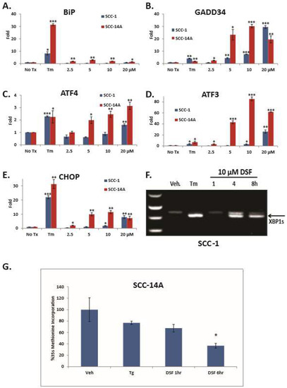 DSF induces ER stress and the UPR in OSCC cell lines. To elucidate the ability of DSF to activate the UPR, SCC-1 and SCC-14A cells were treated for six hours. RT-qPCR revealed dose-dependent increases of transcripts for UPR markers (Figure 2A–E). To independently confirm UPR gene expression a UPR-focused quantitative RT-PCR array was used to interrogate cDNA from DSF-treated SCC1 cells. Transcripts for CHOP, ATF4, GADD34 and a panel of HSPs were significantly upregulated (Supplementary Figure S1). Conventional RT-PCR was used to measure XBP1 splicing (Figure 2F). UMSCC-14A cells were then treated over a six hour period and pulse labeled with 35S-Met. Trichloroacetic acid (TCA) precipitation and radioanalysis confirmed 10 μM DSF could rapidly and significantly reduce protein synthesis (Figure 2G). Considered together, these data indicate that DSF induces ER stress and the UPR in OSCC.