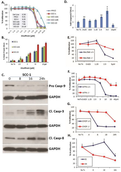 DSF induces UPR-dependent apoptosis and reduces proliferation in OSCC. (A), A panel of OSCC cells treated with increasing doses of DSF for 24 h evaluated with an ATP-based luminescent proliferation assay; data are representative of multiple experiments; error bars represent standard deviation. (B), Similarly treated cell lines evaluated after 24 h with trypan blue exclusion assay to appreciate relative levels of live and dead cells; error bars represent standard deviation. (C), Immunoblot analysis of caspases in whole cell lysates from SCC-1 cells treated with 10 μM DSF. (D), Luminescent real-time measurement of caspase3/7activation in MEFs treated for 4h; error bars represent standard deviation. Two-tailed test: * p ≤ 0.05, ** p ≤ 0.01, *** p ≤ 0.001. (E–H), ATP-based proliferation assays in MEF treated with 5 μM DSF. Bax/Bak double-null MEF; Two-way ANOVA, p ≤ 0.0001 for concentration and interaction, Atf4-null MEF; p < 0.0001 for concentration and interaction. Chop-null MEF; p ≤ 0.0001 for time and interaction and eIF2α Ser51-Ala mutant (A/A) MEF; p ≤ 0.0001 for time and interaction. Wildtype controls were littermate matched MEFs; error bars represent standard deviation.