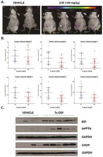 DSF activates UPR in OSCC xenografts and reduces tumor burden. (A), Bioluminescent imaging (BLI) to appreciate CHOP-luciferase activity in mice bearing 3–5 mM tumors. (B), Volumetric (caliper) evaluation of tumors in 8 mice bearing bilateral xenografts and treated either with almond oil carrier or compounding pharmacy prepared DSF over 6 weeks. (C), Immunoblot analysis of UPR markers in whole tumor lysates prepared from xenografts 8 h after final dose of DSF or vehicle, blots were stripped and re-probed for monoclonal antibodies against human GAPDH.