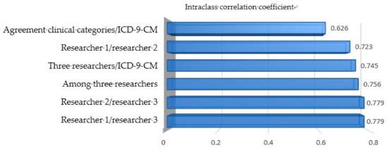 It is noted that the concordance of the PP classification according to the clinical agreement between two or more researchers, and the PP classification according to the ICD-9-CM coding was good. A 0.661 kappa (95% CI; 0.622–0.701) with statistical significance (p < 0.0001) was obtained. Regarding the proportion of global agreement between the observers, a result of 0.844 (95% CI; 0.825–0.862) was obtained. According to the intraclass correlation coefficient of the number of defining categories detected by both methods, a notable result from the three researchers is obtained, as well as a low one from the clinical agreement of two or more researchers and the ICD-9-CM coding, as seen in Figure 1.