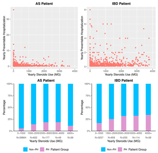 We explored the unadjusted relationship between cumulative yearly corticosteroid dose and number of preventable hospitalizations over the study period (Figure 1). A preliminary analysis shows that higher cumulative corticosteroid exposure seems, in general, to be associated with more hospitalizations. However, it is important to note that across all dosage categories, the majority of both AS and IBD patients had no preventable hospitalizations.