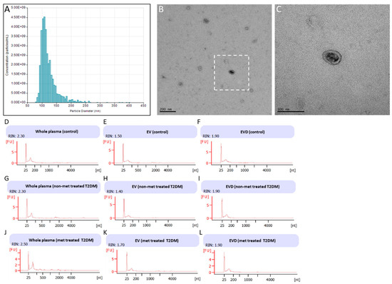 Isolation and characterization of extracellular vesicles (EVs) and RNA from plasma. (A) Histogram of EV isolated from plasma (B,C) EV imaged using TEM (D–J) bioanalyzer traces from whole plasma, EV, and EV-depleted (EVD) samples. (A) Histogram generated by qNano particle tracker of EVs isolated using SEC from patient plasma samples, with an average particle size of 122 nm. (B) Electron micrographs taken from isolated EVs, showing particles of a similar size that have characteristic shape and form of EVs. Black bar represents 200 nm scale. (C) Enlargement of boxed in area in (B). Black bar represents 100 nm scale. (D–L) Agilent RNA bioanalyzer traces of RNA isolated from control plasma (D), control EVs (E), control EVD (F), non-metformin (non-met) treated T2DM plasma (G), non-metformin treated type 2 diabetes mellitus (T2DM) EVs (H), non-metformin treated T2DM EVD (I), metformin (met) treated T2DM plasma (J), metformin treated T2DM EVs (K), and metformin treated T2DM EVD (L).