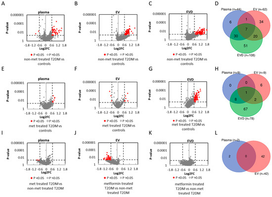 miRNAs with concentration changes between T2DM patients and healthy controls. (A–C) volcano plots for non-metformin (non-met) treated T2DM versus controls. (E–G) volcano plots for metformin (met) treated T2DM versus controls. (I–K) volcano plots for metformin treated versus non-metformin treated T2DM. Volcano plots showing miRNA log2 fold change (log2FC) versus p-value between non-metformin treated T2DM and control samples in plasma (A), EVs (B), EV-depleted (EVD) fractions (C), and (D) overlap between miRNAs that show concentration differences in plasma, EVs, and EVD fractions. Volcano plots showing miRNA log2 fold change (log2FC) versus p-value between treated T2DM and control in plasma (E), EVs (F), EVD fractions (G), and (H) overlap between miRNAs that show concentration differences in plasma, EVs, and EVD fractions. Volcano plots showing miRNA log2 fold change (log2FC) versus p-value between metformin treated T2DM and non-metformin treated T2DM in plasma (I), EVs (J), EVD fractions (K), and (L) overlap between miRNAs that show concentration differences in plasma, EVs, and EVD fractions. Grey unfilled circles represent miRNAs with a p-value >0.05, and red circles represent miRNAs with a p-value < 0.05, and a log2FC > ±0.60 (fold change greater than 1.5).