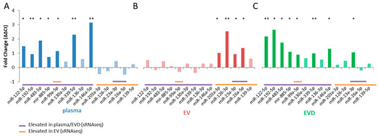 qRT-PCR validation of sRNAseq results in plasma, EVs, and EV-depleted (EVD) plasma. Log2FC for plasma (A), EVs (B) and EVD (C). qRT-PCR validation of sRNAseq data for selected miRNAs in plasma (A), EVs (B), and EVD fractions (C). Results are shown as ΔΔCt values (max cycles − (Ct reference − Ct target). MiR-451a and miR-486-5p were used as standards. Statistically significant results are designated by asterisks (* p < 0.05, ** p < 0.01). Results with p > 0.05 are greyed-out. Corresponding sRNAseq results are shown below as either purple bars (elevated in plasma/EVD) or yellow bars (elevated in EVs).