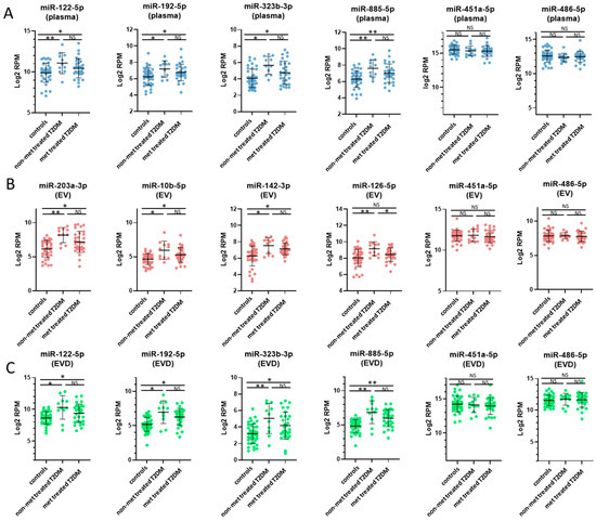 Selected miRNAs with concentration changes between controls and non-metformin (non-met) treated, and metformin-treated (met treated) T2DM. Plots of selected miRNAs showing concertation differences between controls, non-metformin treated T2DM and metformin treated T2DM patients in plasma, EV and EV-depleted samples. Plasma miRNA plots (A) are depicted in blue, EV miRNA plots (B) are depicted in red, and EV-depleted miRNA plots (C) are depicted in green. The values are in log2 RPM (log2 transformed reads per million), with each dot representing a patient sample. The invariant miRNAs, miR-451a-5p and miR-485-5p, are also shown. Statistically significant results are designated by asterisks (* p < 0.05, ** p < 0.01), and non-significant results are designated as ‘NS’.