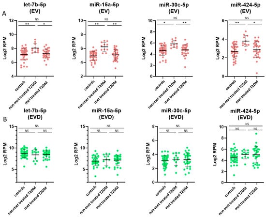 EV-specific miRNAs that reflect changes both associated with T2DM and treatment with metformin. Plots of selected miRNAs showing concertation differences between controls, non-metformin (non-met) treated T2DM and metformin (met) treated T2DM patients in EV and EV-depleted (EVD) plasma samples. EV miRNA plots (A) are depicted in red, and EV-depleted plasma miRNA plots (B) are depicted in green. The values are in log2 RPM (log2 transformed reads per million), with each dot representing a patient sample. Statistically significant results are designated by asterisks (* p < 0.05, ** p < 0.01), and non-significant results are designated as ‘NS’.
