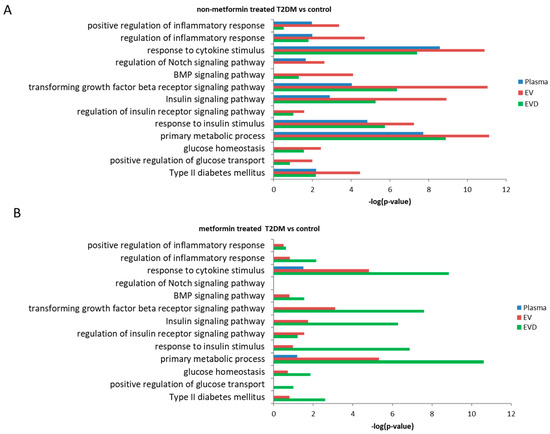 Predicted biological pathways and processes associated with T2DM in whole plasma, EVs, and EV-depleted plasma (EVD). (A) non-metformin (non-met) T2DM versus control, (B) metformin (met) treated T2DM versus control, Bar graph showing fold enrichment of selected T2DM-realted biological terms/pathways associated with plasma (blue), EV (red), and EVD (green) miRNA targets Values are –log10 transformed FDR corrected p-values.