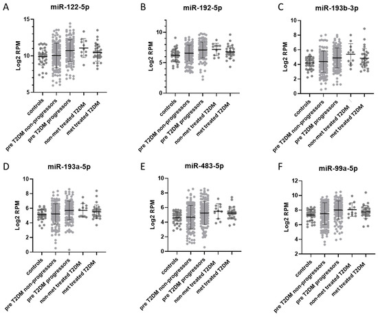 Comparison of plasma miRNAs between METSIM (prediabetic T2DM) and MetaHIT (T2DM treated with metformin). (A) miR-122-5p, (B) miR-192-5p, (C) miR-193b-3p, (D) miR-193a-5p, (E) miR-483-5p, (F) miR-99a-5p. Plots of selected plasma miRNAs that overlap between METSIM and MetaHIT datasets. The levels of miRNAs from MetaHIT data are shown as dark grey dots, while the miRNA levels from the METSIM data (Ghai et al. 2019a) are shown as light grey dots. The values are in log2 RPM (log2 transformed reads per million), with each dot representing a patient sample.