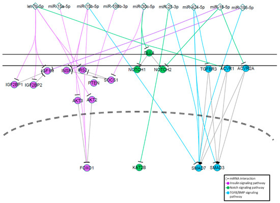 Signaling pathways modulated by EV miRNAs associated with T2DM. Pathway diagram showing selected EV miRNAs (diamonds) that change in response to metformin treatment directly regulating critical targets of insulin signaling (purple), Notch signaling (green), and TGFβ/BMP signaling (cyan).