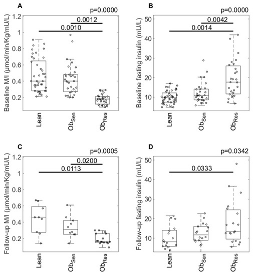 Between-group analysis at the follow-up time point revealed that M/I at follow-up in ObSen remained significantly higher compared to ObRes, and not different from Lean (Figure 2C). Fasting insulin was not significantly different between ObSen and ObRes at follow-up (p = 0.13), but remained lower in Lean compared with ObRes (Figure 2D).