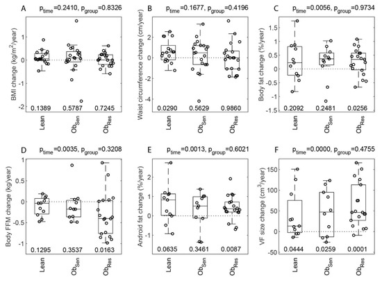 Surprisingly, BMI (ptime = 0.24, Figure 3A) and waist circumference (ptime = 0.17, Figure 3B) did not change significantly over time in this cohort. However, body fat increased significantly over time (ptime = 0.006, Figure 3C). Other anthropometric and body composition (DXA-derived) variables changed significantly over time, and while none showed a significant difference between groups (Figure 3), in many the significant changes over time were driven by the ObRes group (as evaluated by one-way t-test, Bonferroni-corrected and accepting p ≤ 0.0167 as statistically significant). For example, FFM decreased significantly (ptime = 0.0035, Figure 3D), and the change with time primarily driven by the ObRes (p = 0.0163). Similarly, fat content in the android region increased significantly over time (ptime = 0.0013, Figure 3E), driven by the ObRes group (p = 0.0087, Figure 3E). Visceral fat volume increased over time (ptime < 0.001, Figure 3F), driven by a significant increase in the ObRes (p = 0.0001, Figure 3F). On the other hand, gynoid region mass decreased significantly in the cohort (ptime < 0.001), also driven by a decrease in the ObRes (p = 0.0005).