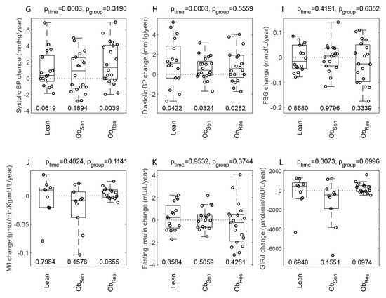 Change in anthropometry, metabolic health and glucose regulation markers from baseline to follow-up in Lean and overweight/obese insulin-resistant and insulin-sensitive individuals. Annual change in body mass index (BMI) (A), waist circumference (B), body fat (C), fat-free mass (D), android fat (E), visceral fat (F), systolic (G) and diastolic (H) blood pressure, fasting blood glucose (I), M/I (J), fasting insulin (K) and glucose infusion rate (GIR)/I (L) in Lean and overweight/obese individuals. Change (IQR) in variables as a function of time, for each of the baseline groups: Lean, ObRes and ObSen. The change was determined as . Differences between the groups were assessed using a Welsh’s ANOVA (accounting for unequal variances in the change data) with the Games–Howell posthoc test. The pgroup value is indicated at the top of each plot for each variable. Changes over time for the cohort were assessed using a one-sample t-test for difference from zero with ptime also indicated at the top of each plot. The p values for the differences from zero for each individual group are shown at the bottom of each plot. A correction for multiple comparisons (Bonferroni) was applied with significance set at p ≤ 0.0167. Data are individual values of change (IQR). Abbreviations: WC, waist circumference; FFM, fat-free mass; SBP, systolic blood pressure; DBP, diastolic blood pressure; FBG, fasting blood glucose.
