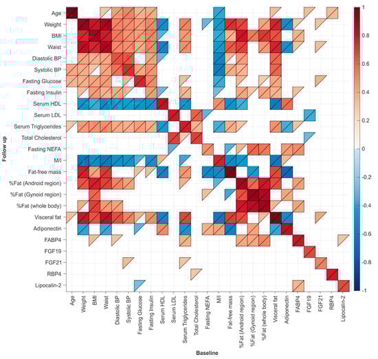 Associations between baseline and follow-up metabolic health, anthropometry and body composition. Pairwise Spearman coefficients were calculated and the p values determined. If 0 ≤ p < 0.05, then the R value of the correlation is shown in color, with upper triangle indicating 0 ≤ p < 0.05, and lower triangle indicating 0 ≤ p < 0.01 for the correlation. The correlation coefficient is indicated using the color scale.