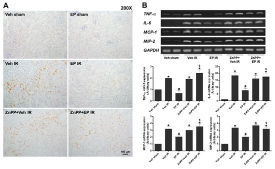 To determine the effect of EP on IR-induced renal inflammation, renal sections were subjected to immunohistochemical staining of polymorphonuclear leukocytes. Renal IR caused neutrophil infiltration particularly at cortex-medullary junctions, which was significantly reduced by EP. However, the effect of EP was blocked by ZnPP pretreatment (Figure 2A). The mRNA levels of proinflammatory cytokines and chemokines were measured in the kidney tissues at 5 h after reperfusion (Figure 2B). EP significantly reduced the levels of TNF-α, IL-6, MCP-1 and MIP-2 compared to vehicle. ZnPP pretreatment blocked the effects of EP on reducing these mRNA levels. The results indicate that EP reduced IR-induced renal inflammation through HO-1.